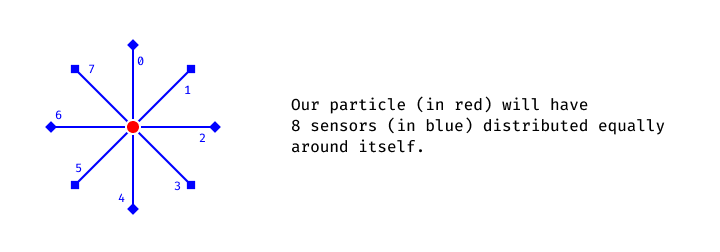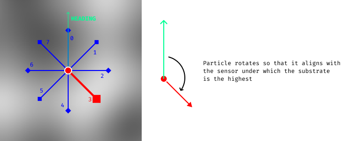 | READ | Particles sample the substrate using 16 (8×2) sensors around themselves. 8 sensors are used for the attraction, 8 for the repulsion. The offsets of attraction/repulsion sensors can be controlled independently. |