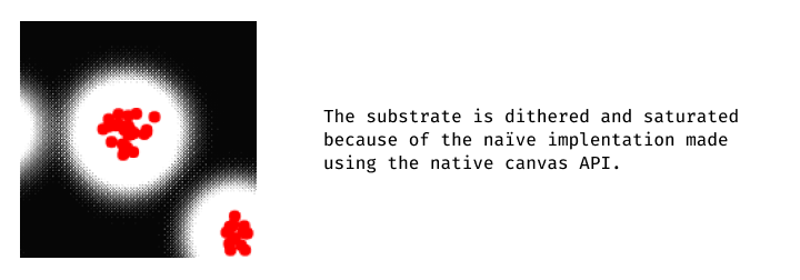 This is not ideal. But at this point, the lack of precision of the substrate is what prevents this example from behaving as expected. Because values of the substrate are stored in a [0; 255] range, too much behavior is lost because of those precision issues. The side-effect dithering is probably not helping as well. It’s time to run this exact same simulation on the GPU !