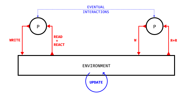 - READ + REACT: how do particles read the substrate(s) in the environment, and how do they react according to it ? I put Read and React operations together because the reaction will always depend on the way the data is read from the environment. They can be described separately though.