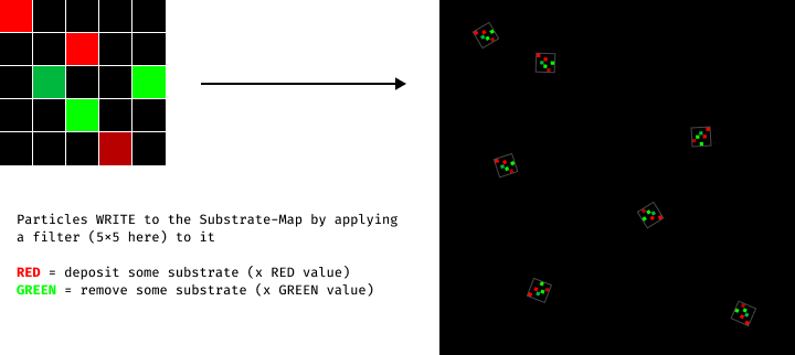 | WRITE | Particles deposit and remove substrate by applying a NxN filter composed of RED and GREEN values. (RED = add substrate, GREEN = remove substrate) |