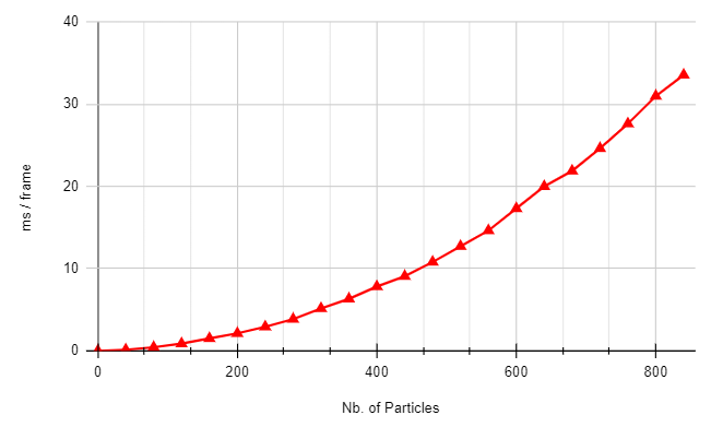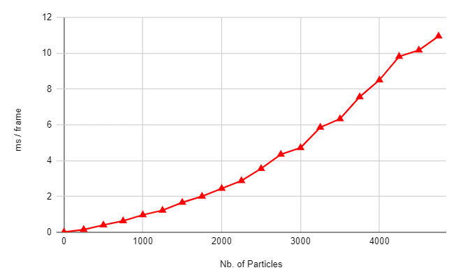 Because this system doesn’t require each particle to interact with each other, the complexity is , which allows us to add more particles more easily, without running into performance caveats: