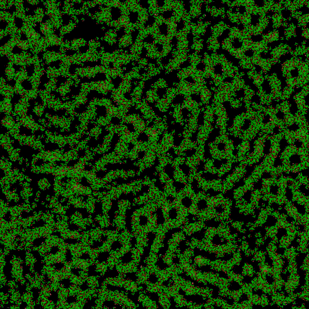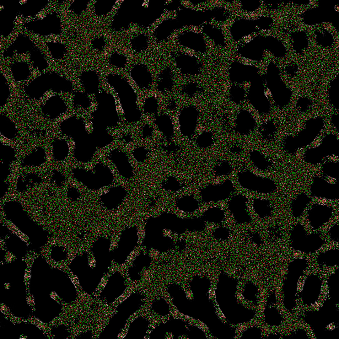 I was talking before about the possibility to have different substrates in the environment. I have been working on a variant of the physarum simulation, where different species can produce different substrates. Here is a result I was able to get with such a system: