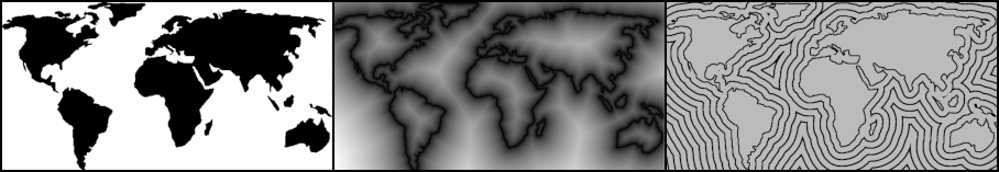 Figure 7. 2 ways to visualize the distance from any pixel of the map of the world to the continents [source: prideout.net]