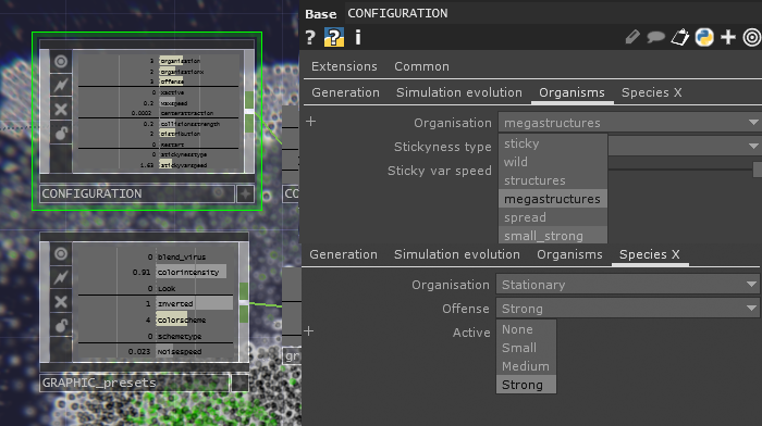 This project was also a great candidate to apply a new design concept to my artworks. I used to expose all the parameters having influence over my simulations, and in the end I was struggling a bit to find and save nice combinations I explored. I realized that creating presets that would generate values for these parameters based on a range defined by some higher level controls could benefit the quality of my control over my simulations. For instance in Clusters X, I can control the likeness of a new set of rules to output a particular type of organisms.